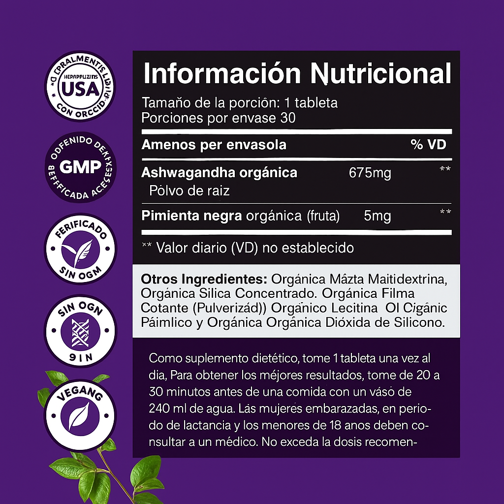 - ELABORADO CON INGREDIENTES DE ORIGEN MUNDIAL – Nuestros suplementos adaptógenos de ashwagandha son orgánicos certificados, no contienen OMG, no contienen alcohol y se producen en una planta con certificación GMP. Esta ashwagandha extra fuerte no contiene gluten, lácteos, soja, frutos secos, azúcar ni ingredientes artificiales.
