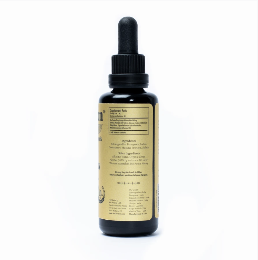 Esta mezcla de elixir trascendente que incluye: Ashwagandha, fenogreco, grosella espinosa india (Alma), Mucuna Pruriens y Shilajit puede admitir: